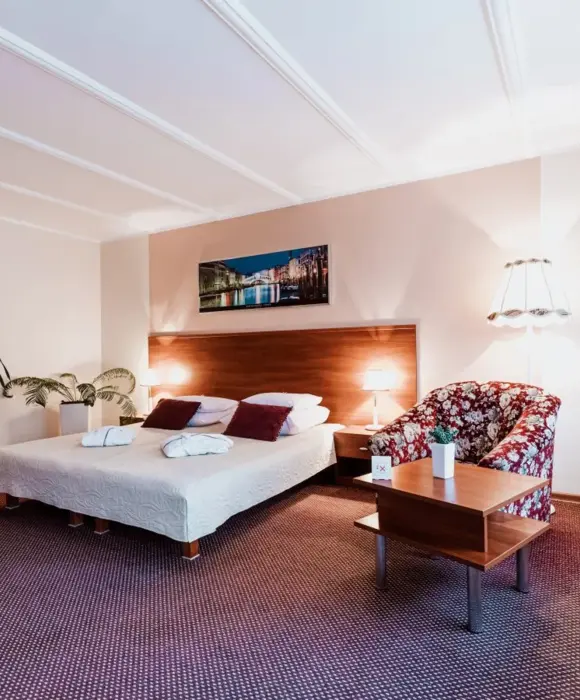 Hotel posiada 50 komfortowych pokoi. Do dyspozycji Gości dostępna jest również: restauracja z prawdziwą domową kuchnią oraz kawiarnią dla smakoszy „małej czarnej“ lub wielbicieli kolorowych trunków.