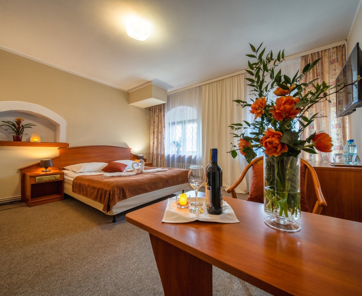 Do Państwa dyspozycji oddajemy 45 pokoi standardowych w tym pokoje typu studio. W każdym z pokoi znajduje się telefon, telewizor oraz łazienka wyposażona w prysznic, a w studiach wanna narożna. W pokoju znajdziecie Państwo zestaw ręczników. W obiekcie dostępna jest bezprzewodowa sieć internetowa.