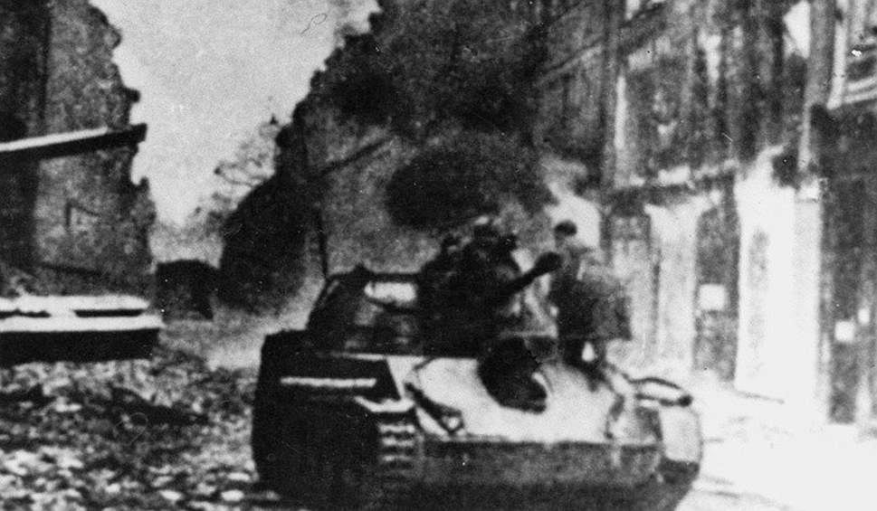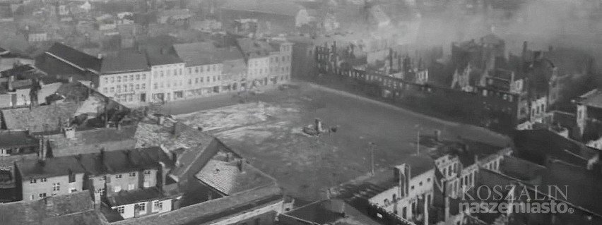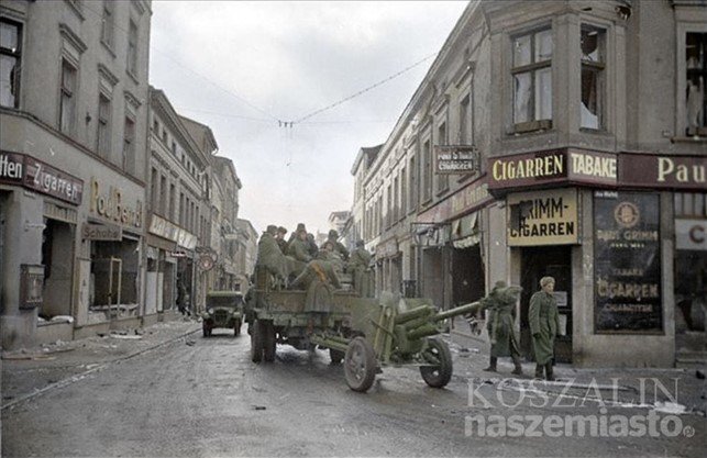 Blick auf die ulica Zwycięstwa in Richtung des Bahnhofs. Das Eckgebäude auf der rechten Seite überstand die Kämpfe, lag jedoch im Sommer 1945 in Trümmern. Heute befindet sich an dieser Stelle das Cafe Mondo.
