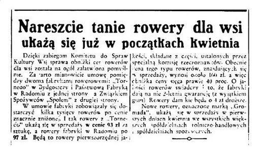Eine andere wichtige Initiative der Vorkriegsgenossenschaft "Gromada"war die Bestellung an den staatlichen Fabriken in Radom und Bydgoszcz, für die Parteien von hunderttausend Fahrrädern unter dem Namen "Gromada". Das "Gromada" -Management hat im Sommer 1939 Verhandlungen mit dem Fahrradwerk von Bydgoszcz mit dem Ziel begonnen, einen Vertrag für die Produktion von 500.000 weiteren Fahrrädern abzuschließen.