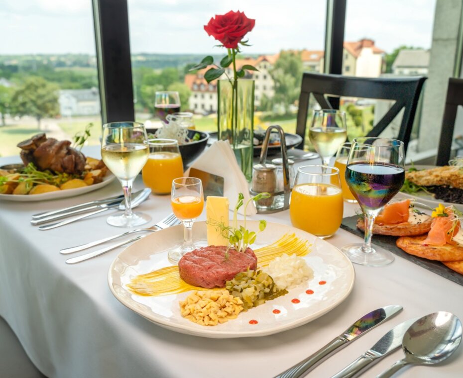 Rinderfilet / Zwiebel / Essiggurke / Champignon / Kapern / Eigelb / Senf / Butter / Brot