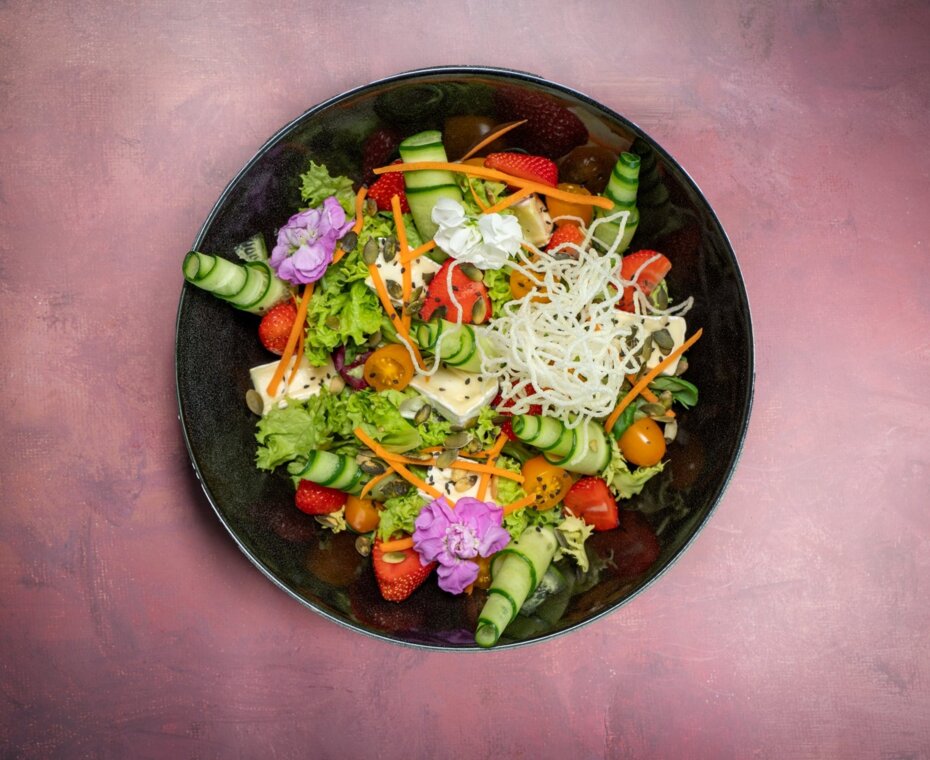 Sałata / pieczony ser camemebert / żurawina / oliwki suszony pomidor / makaron z marchwi / prażone pestki / ogórek / dressing vinegret