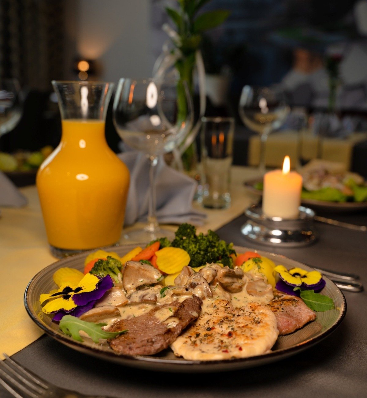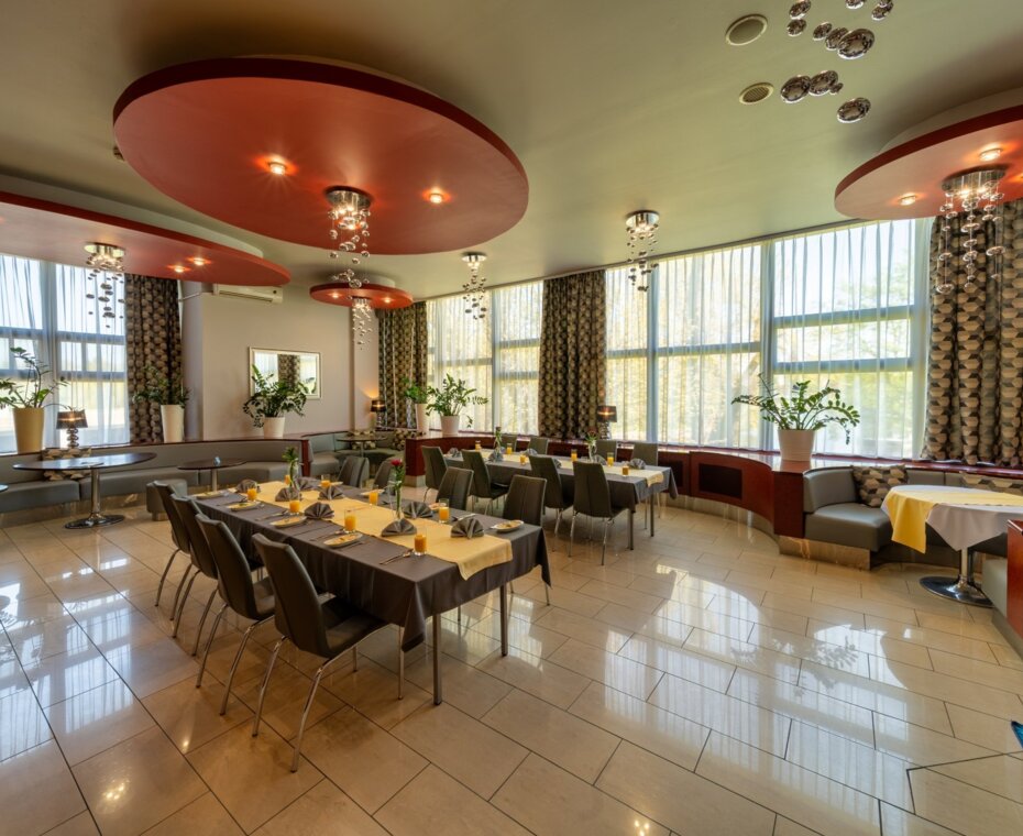 Klimatyzowana restauracja hotelowa to miejsce spotkań biznesowych i organizacji imprez okolicznościowych takich jak chrzciny, komunie, jubileusze, ale także doskonała opcja na rodzinny obiad, kolację czy spotkanie z przyjaciółmi. Serwując smaczne dania i zapewniając wysoką jakość usług staramy się zaspokoić gusta najbardziej wymagających Gości.