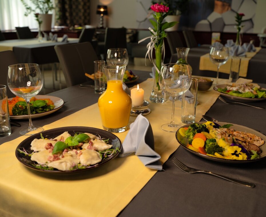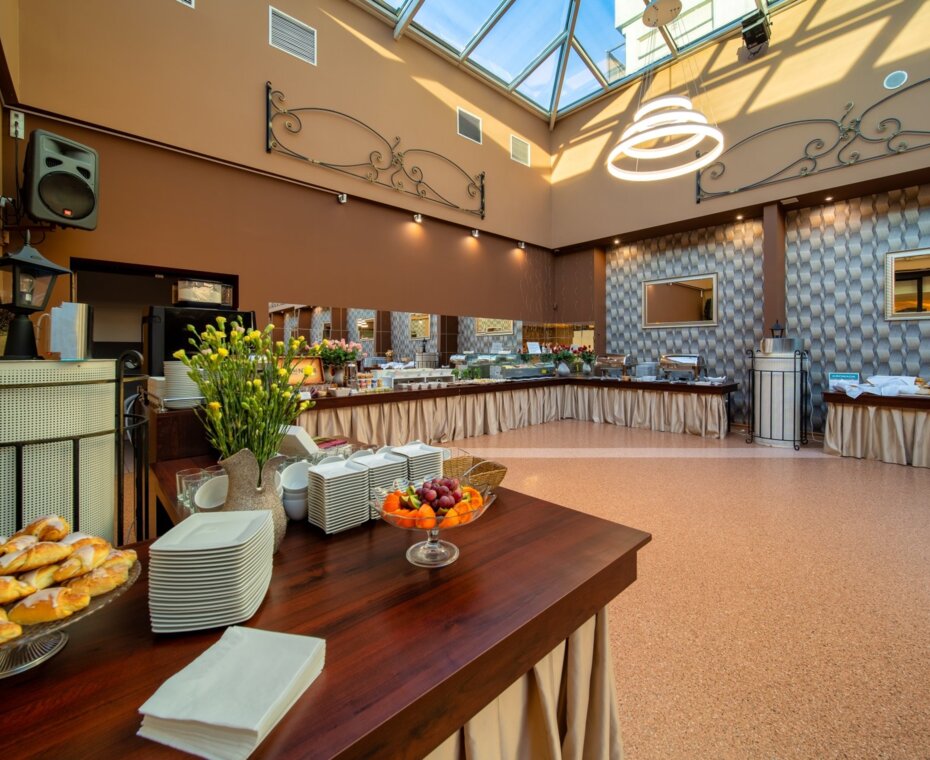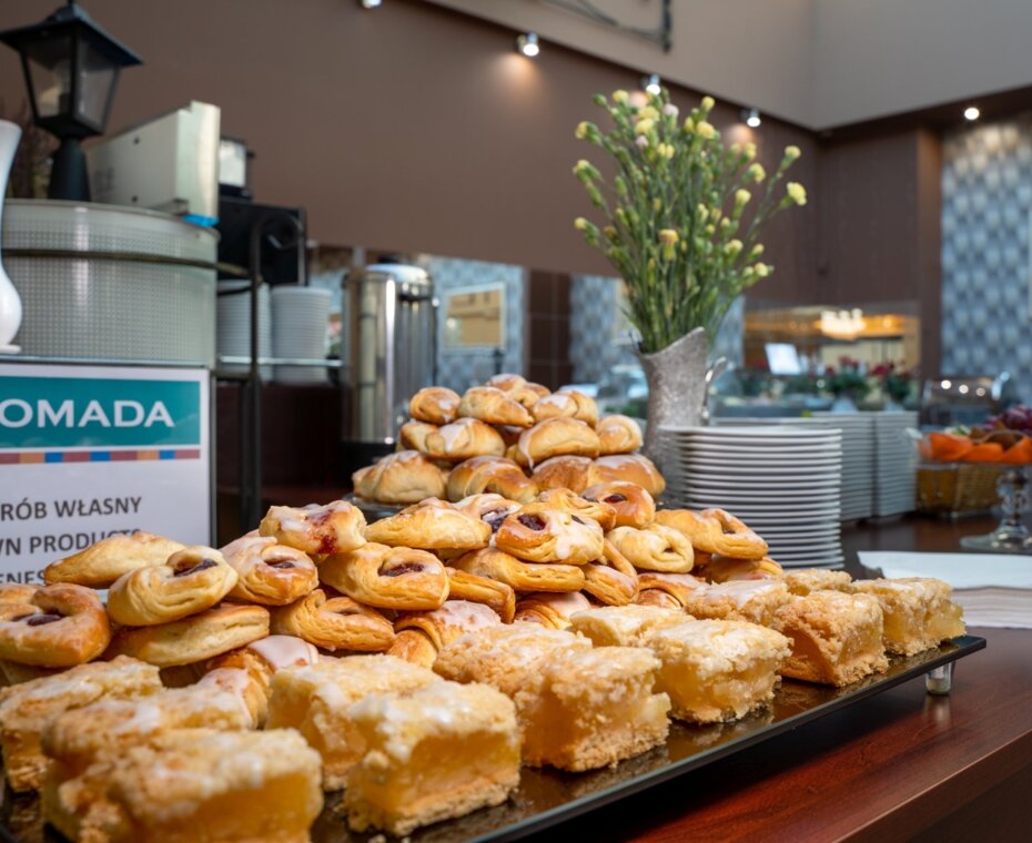 Nasze menu zmienia się wraz z porami roku, aby w pełni wykorzystać świeże i naturalne produkty sezonowe. Codziennie w godzinach od 6:30 do 10:00 serwujemy bogate śniadania w formie bufetu, które w przystępnej cenie oferujemy również osobom nie zamieszkującym w hotelu. Na śniadaniach serwujemy świeże, wypiekane we własnej piekarni pieczywo oraz smaczne ciasta.