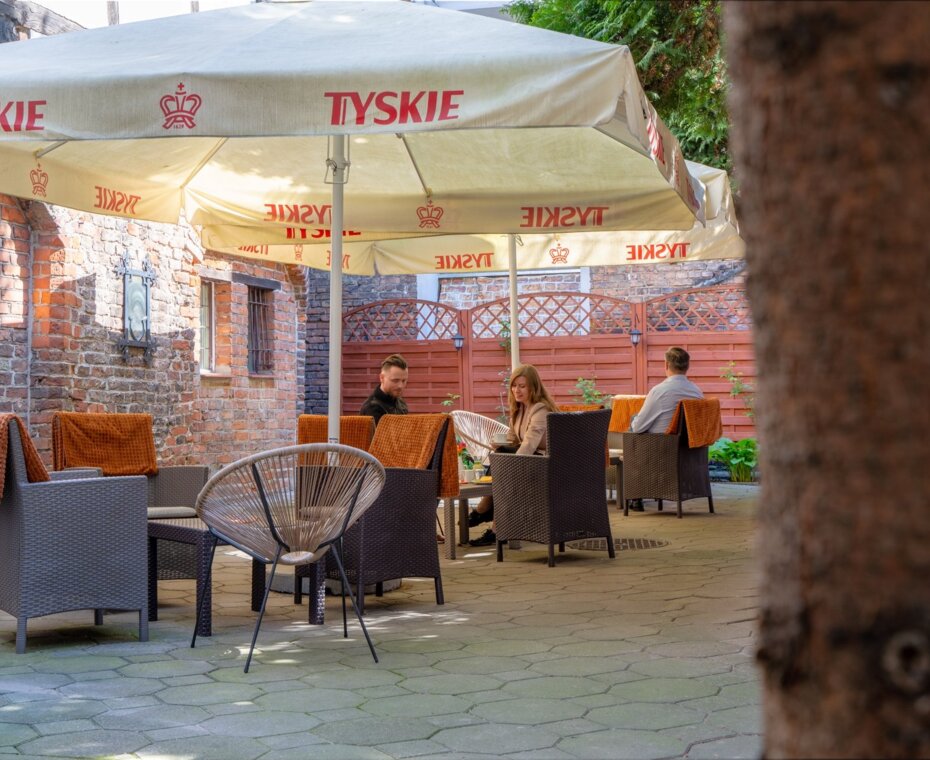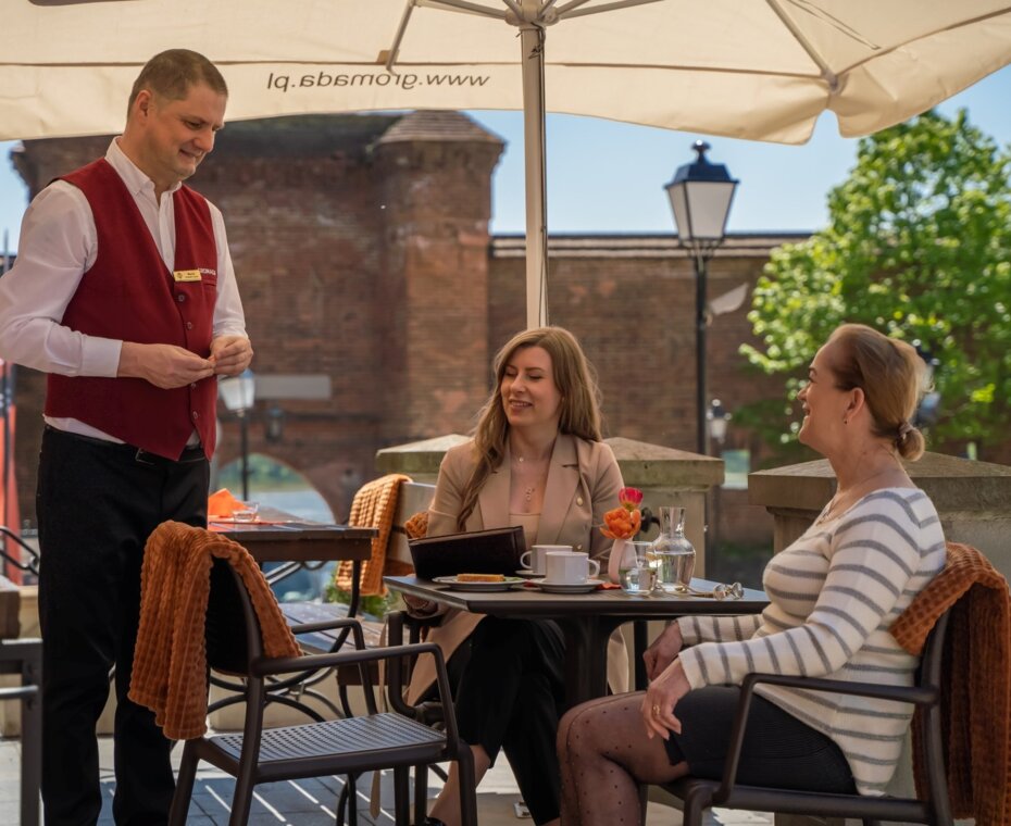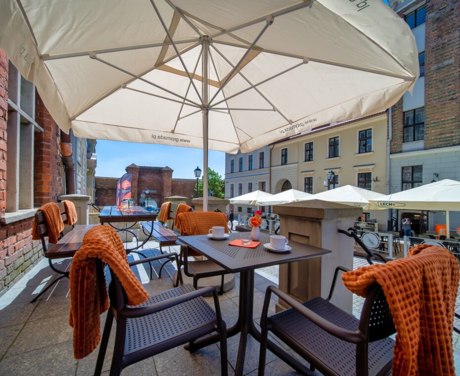Die Terrasse des Hotel Gromada in Toruń ist eine charmante Ecke mit Blick auf das Seglertor, den Fluss Weichsel und die Basilika St. Johannes der Täufer und St. Johannes der Evangelist, die nur 50 Meter vom Hotel Gromada entfernt liegt.