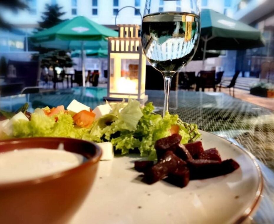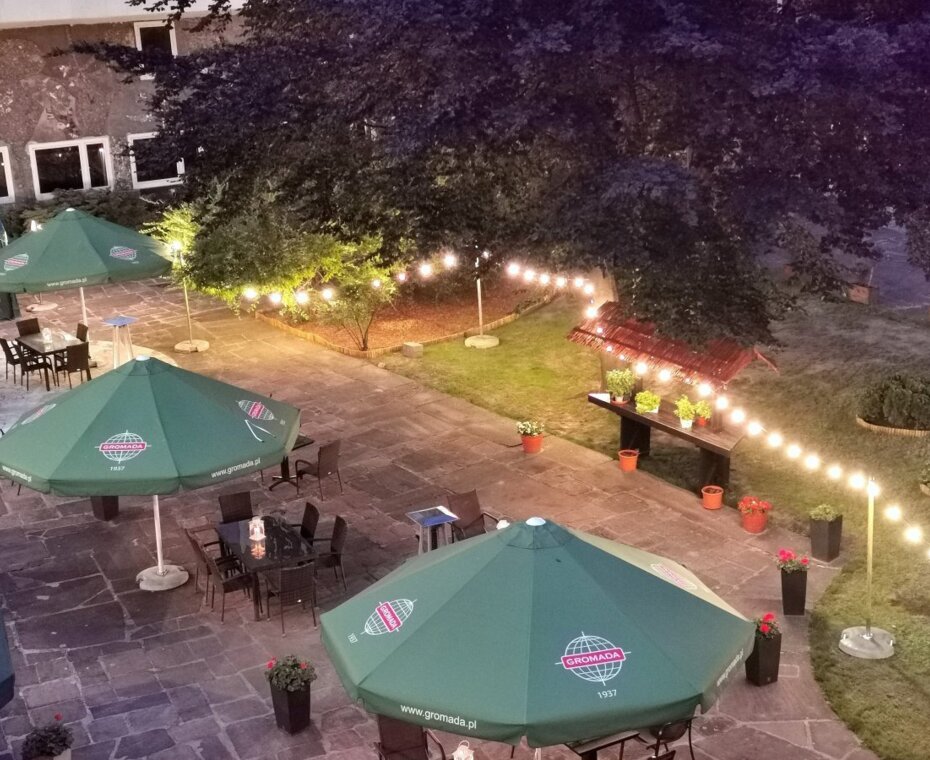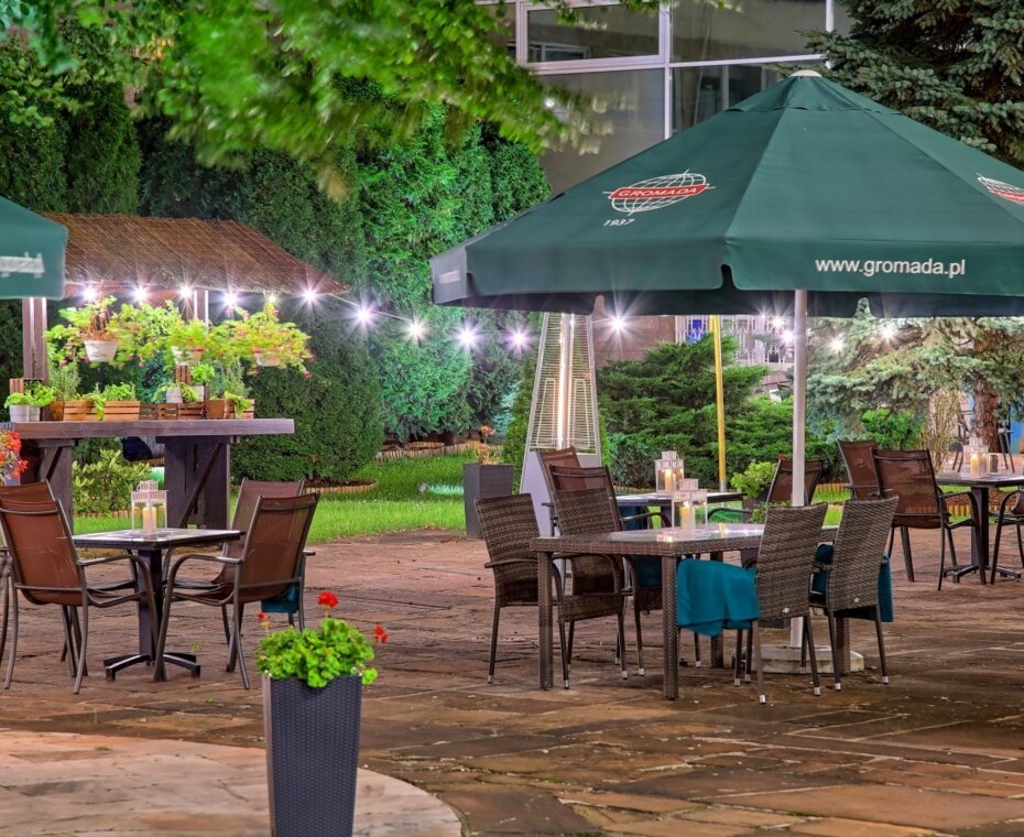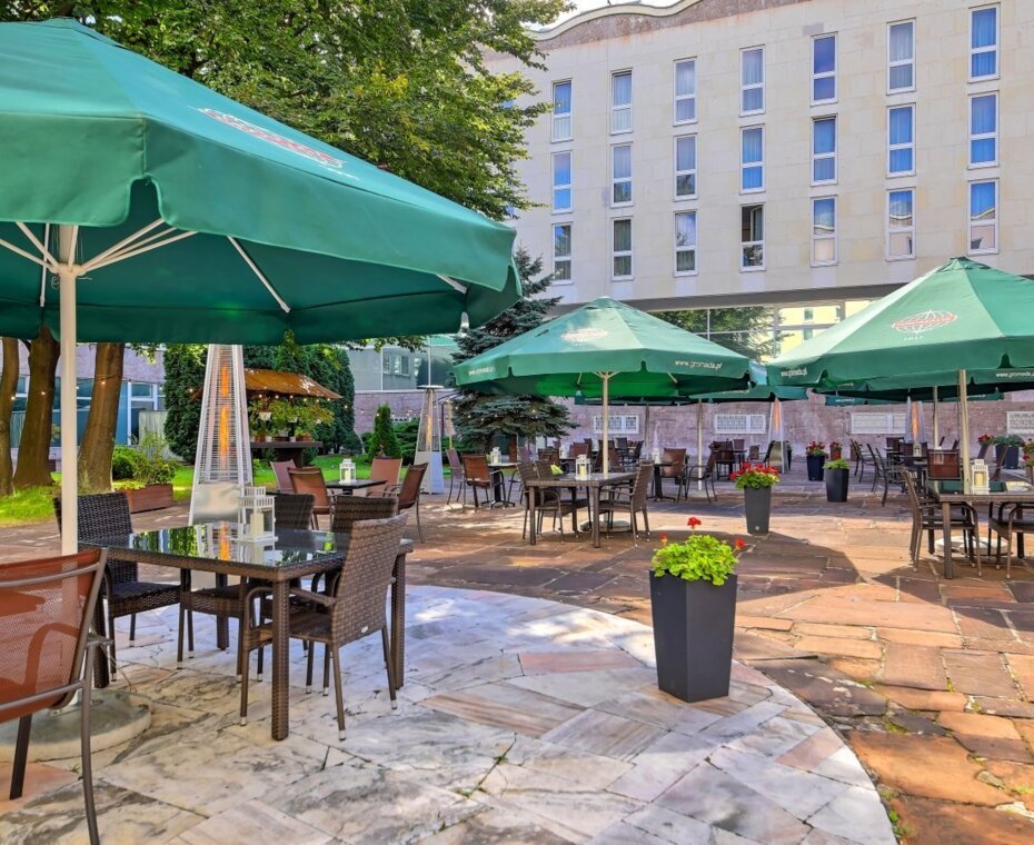 Terrasse „Zielony Zakątek“ Mit einer Fläche von 1.200 m2 ist es eine wahre Oase der Ruhe im Herzen des Hotels. Umgeben von viel Grün, Blumen und Pflanzen schafft es eine bezaubernde Atmosphäre und der umzäunte Terrassenbereich bietet unseren Gästen einen Rückzugsort vom hektischen Treiben der Stadt.